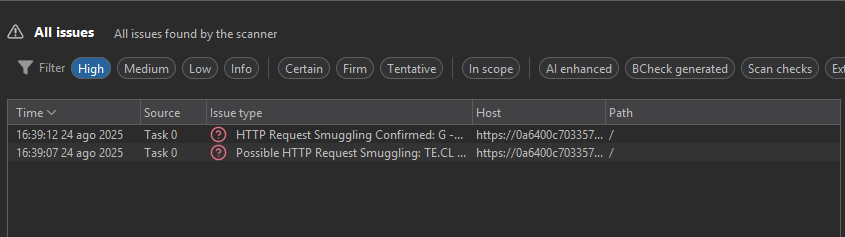 💡 Tip: Always use tools like Burp Suite's "HTTP Request Smuggler" extension to automate discovery. Check for CL.TE first to avoid poisoning the socket for other users.