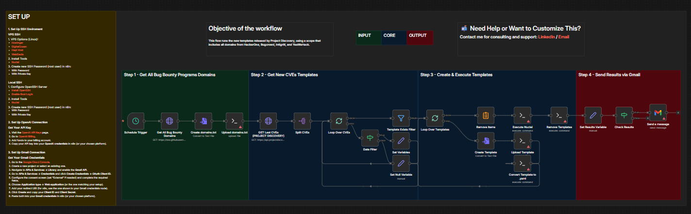 - It executes Nuclei with the new templates against the domains list using configured flags (concurrency, rate limits, severity tags).